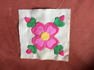 I finally just got this 4.5 inch block done! How do you eat an elephant? One bite at a time! I started on the outside for the tips of the flowers and worked my way to the inside. The big pink flower in the middle was one piece and then I finally got a fairly yellow circle in the middle!
