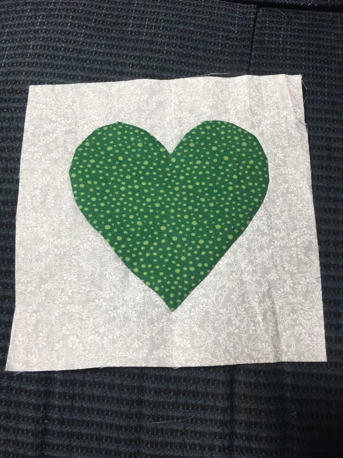 My heart is cut out of a 5 inch charm square and placed on a 7 inch background. I just drew around the heart onto the fabric. I trimmed it around the drawn line and will use needle turn appliqué to finish it off. The blocks will be trimmed down to 6.5 inches once they are all appliquéd down. I am planning to set mine with a scrappy nine patch block using 2.5 inch squares.
