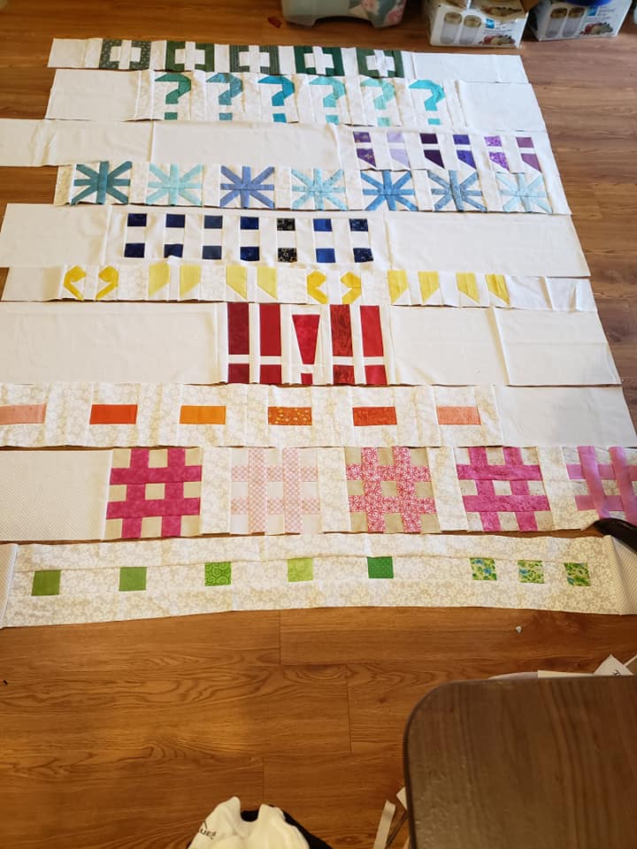 These are the rows for my Full stop. I need to check and make sure they are all going the 'correct' way. Then.... since I did not use a consistent background I need to find some white on white fabrics and make them all the same size. My asterisks are the longest row so I think I'll add a little to each side of that one and then make all the others that size - maybe up to 56 inches across? That should be a good lap size I think. I doubt this will be the final look but we will see how they look once I have added the white to lengthen each of the rows. Maybe one more row with the letters Full Stop? Hmmmmm.