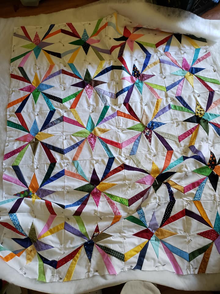 This is the leaning tower of my sets of 4 hexagons that are stitched together so far. Almost time to start making them into sets of 8!
